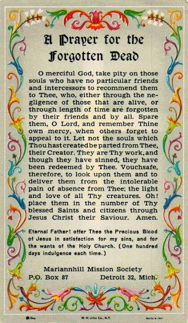 O merciful God, take pity on those souls who have no particular friends and intercessors to recommend them to Thee, who, either through the negligence of those who are alive, or through length of time are forgotten by their friends and by all. Spare them, O Lord, and remember Thine own mercy, when others forget to appeal to it. Let not the souls which Thou hast created be parted from thee, their Creator.May the souls of all the faithful departed, through the mercy of God, rest in peace. Amen.